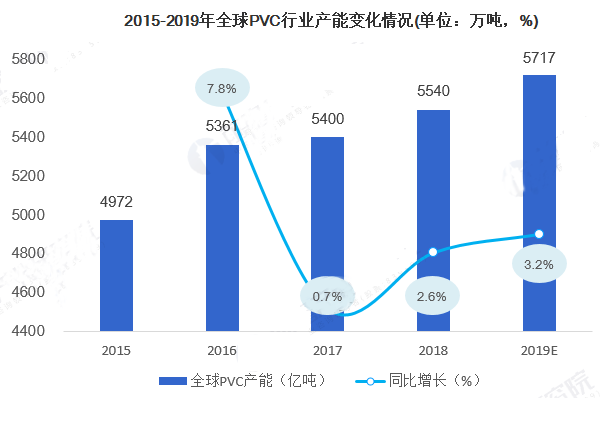 根据IHS数据,2018年全球PVC生产能力为5540万吨,而在2019年,全球PVC生产能力约为5717万吨。